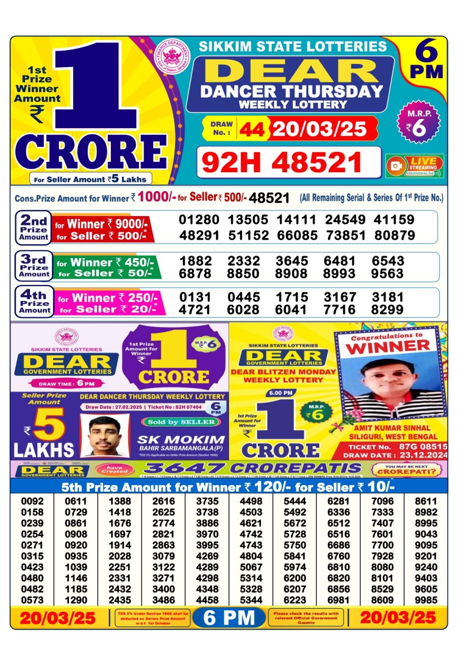 डिअर लाटरी का शाम 6 बजे का रिज़ल्ट दिनांक  07.11.25