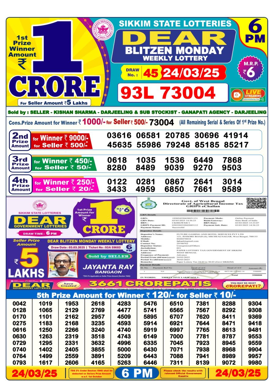 Nagaland State Lotteries was established in the year 1972 under the supervision of the Finance Department to generate a dependable source of revenue for the State Government. Nagaland State Lottery is held every day of the week at three different times of the day, Morning, Day, and Evening. Every day, the lottery is held under a different name with some difference in the prize money with the top prize worth ₹1 Crore (including Super Prize amount). The daily lotteries hosted by Nagaland State include Dear Morning Lottery, Dear Day Lottery, and Dear Evening Lottery which costs 6 Rupees for each ticket.