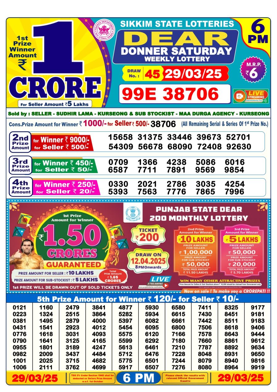 Nagaland State Lotteries was established in the year 1972 under the supervision of the Finance Department to generate a dependable source of revenue for the State Government. Nagaland State Lottery is held every day of the week at three different times of the day, Morning, Day, and Evening. Every day, the lottery is held under a different name with some difference in the prize money with the top prize worth ₹1 Crore (including Super Prize amount). The daily lotteries hosted by Nagaland State include Dear Morning Lottery, Dear Day Lottery, and Dear Evening Lottery which costs 6 Rupees for each ticket.