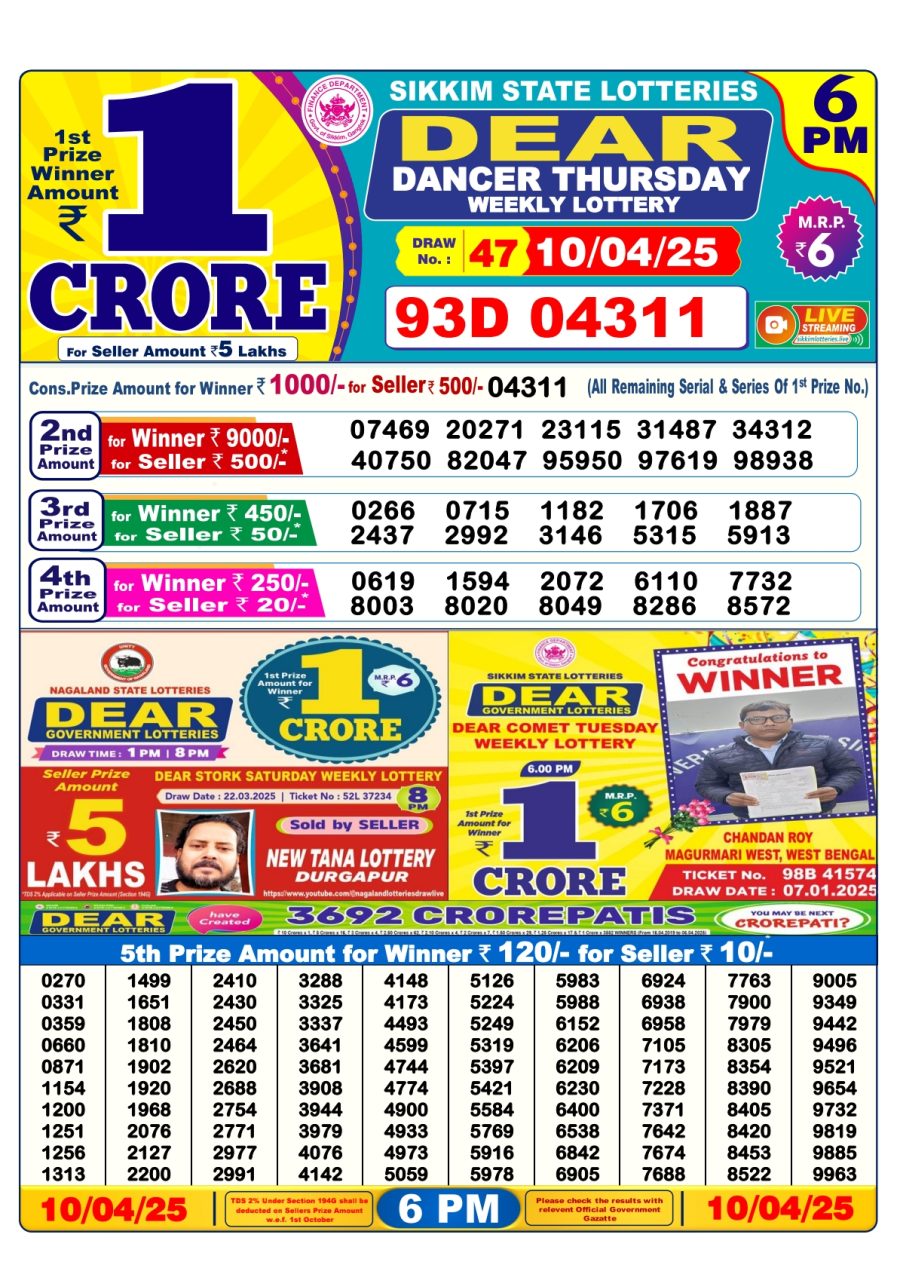 Nagaland State Lotteries was established in the year 1972 under the supervision of the Finance Department to generate a dependable source of revenue for the State Government. Nagaland State Lottery is held every day of the week at three different times of the day, Morning, Day, and Evening. Every day, the lottery is held under a different name with some difference in the prize money with the top prize worth ₹1 Crore (including Super Prize amount). The daily lotteries hosted by Nagaland State include Dear Morning Lottery, Dear Day Lottery, and Dear Evening Lottery which costs 6 Rupees for each ticket.
