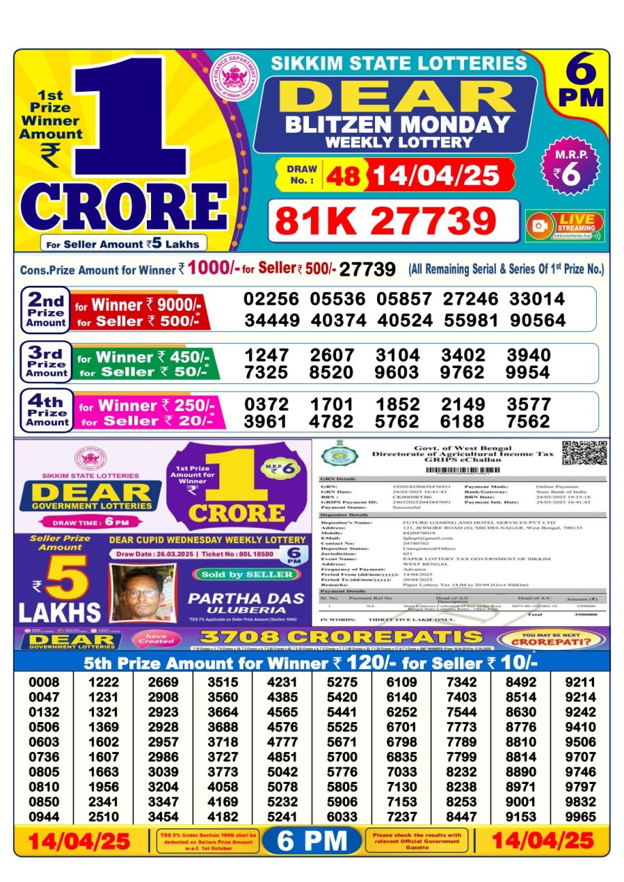 डिअर लाटरी का शाम 6 बजे का रिज़ल्ट दिनांक  03.12.25