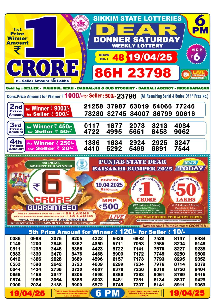 Nagaland State Lotteries was established in the year 1972 under the supervision of the Finance Department to generate a dependable source of revenue for the State Government. Nagaland State Lottery is held every day of the week at three different times of the day, Morning, Day, and Evening. Every day, the lottery is held under a different name with some difference in the prize money with the top prize worth ₹1 Crore (including Super Prize amount). The daily lotteries hosted by Nagaland State include Dear Morning Lottery, Dear Day Lottery, and Dear Evening Lottery which costs 6 Rupees for each ticket.