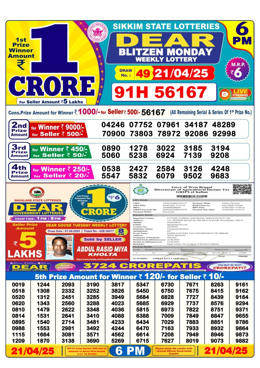 Nagaland State Lotteries was established in the year 1972 under the supervision of the Finance Department to generate a dependable source of revenue for the State Government. Nagaland State Lottery is held every day of the week at three different times of the day, Morning, Day, and Evening. Every day, the lottery is held under a different name with some difference in the prize money with the top prize worth ₹1 Crore (including Super Prize amount). The daily lotteries hosted by Nagaland State include Dear Morning Lottery, Dear Day Lottery, and Dear Evening Lottery which costs 6 Rupees for each ticket.