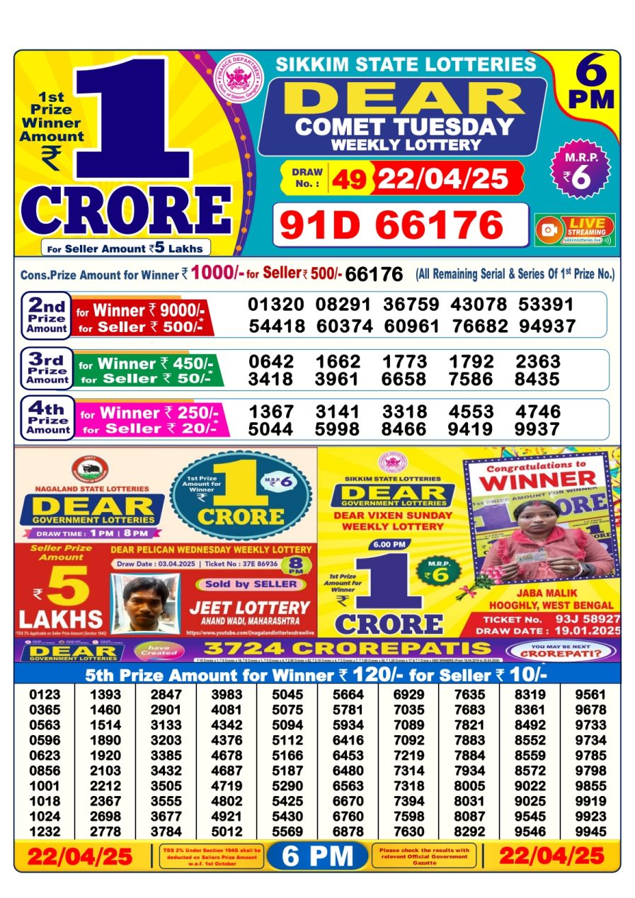 Nagaland State Lotteries was established in the year 1972 under the supervision of the Finance Department to generate a dependable source of revenue for the State Government. Nagaland State Lottery is held every day of the week at three different times of the day, Morning, Day, and Evening. Every day, the lottery is held under a different name with some difference in the prize money with the top prize worth ₹1 Crore (including Super Prize amount). The daily lotteries hosted by Nagaland State include Dear Morning Lottery, Dear Day Lottery, and Dear Evening Lottery which costs 6 Rupees for each ticket.