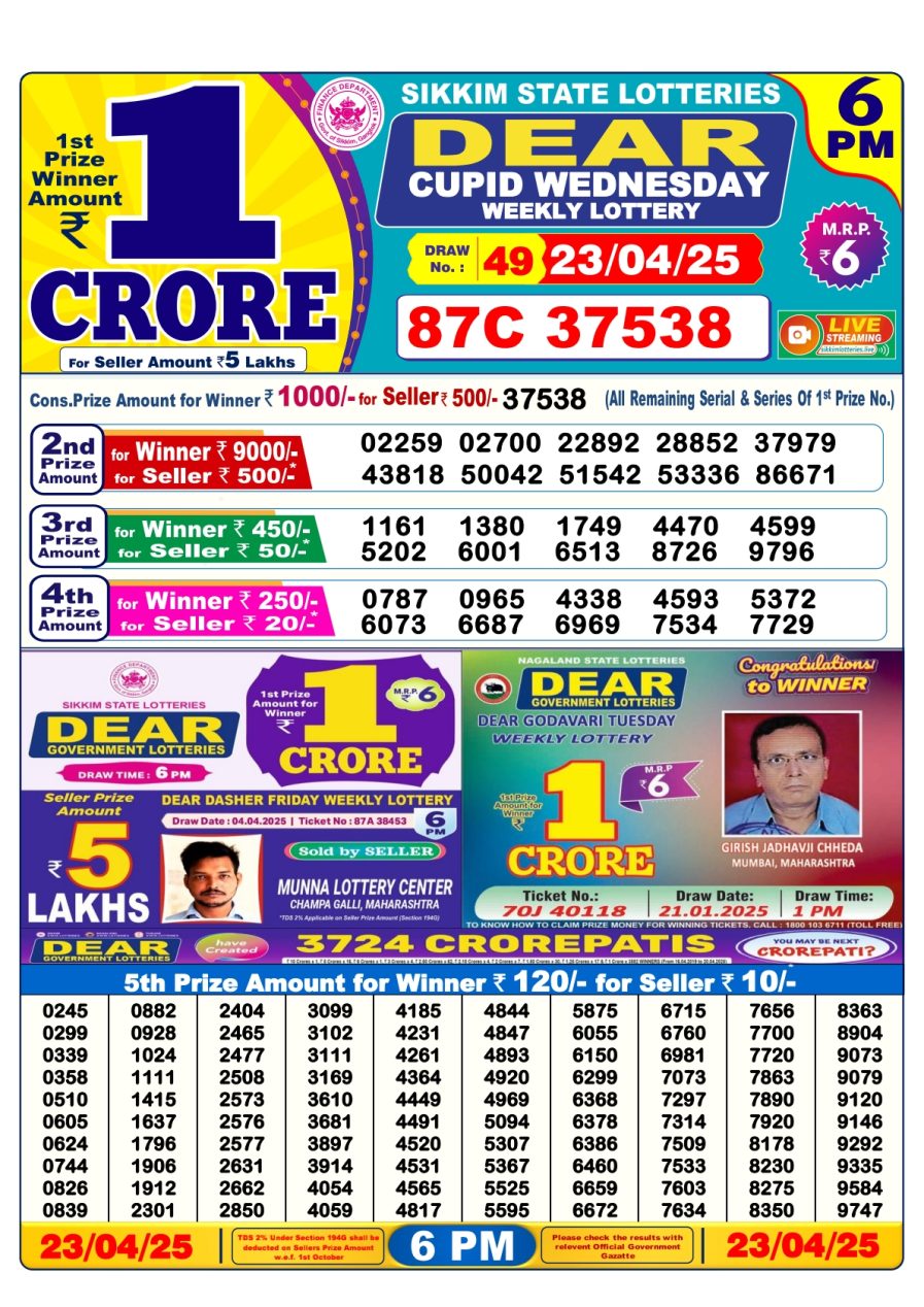 Nagaland State Lotteries was established in the year 1972 under the supervision of the Finance Department to generate a dependable source of revenue for the State Government. Nagaland State Lottery is held every day of the week at three different times of the day, Morning, Day, and Evening. Every day, the lottery is held under a different name with some difference in the prize money with the top prize worth ₹1 Crore (including Super Prize amount). The daily lotteries hosted by Nagaland State include Dear Morning Lottery, Dear Day Lottery, and Dear Evening Lottery which costs 6 Rupees for each ticket.