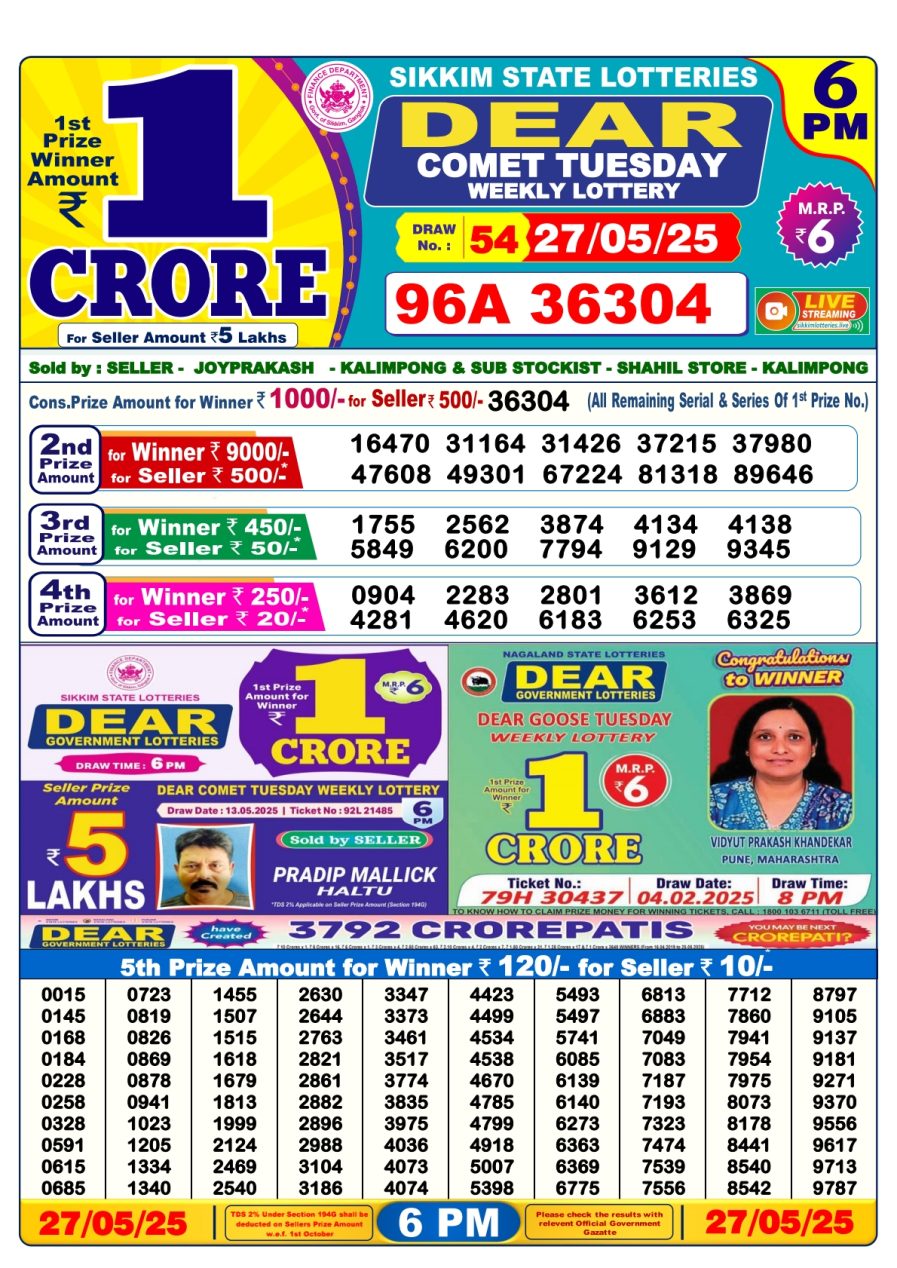 डिअर लाटरी का शाम 6 बजे का रिज़ल्ट दिनांक 27.5.25