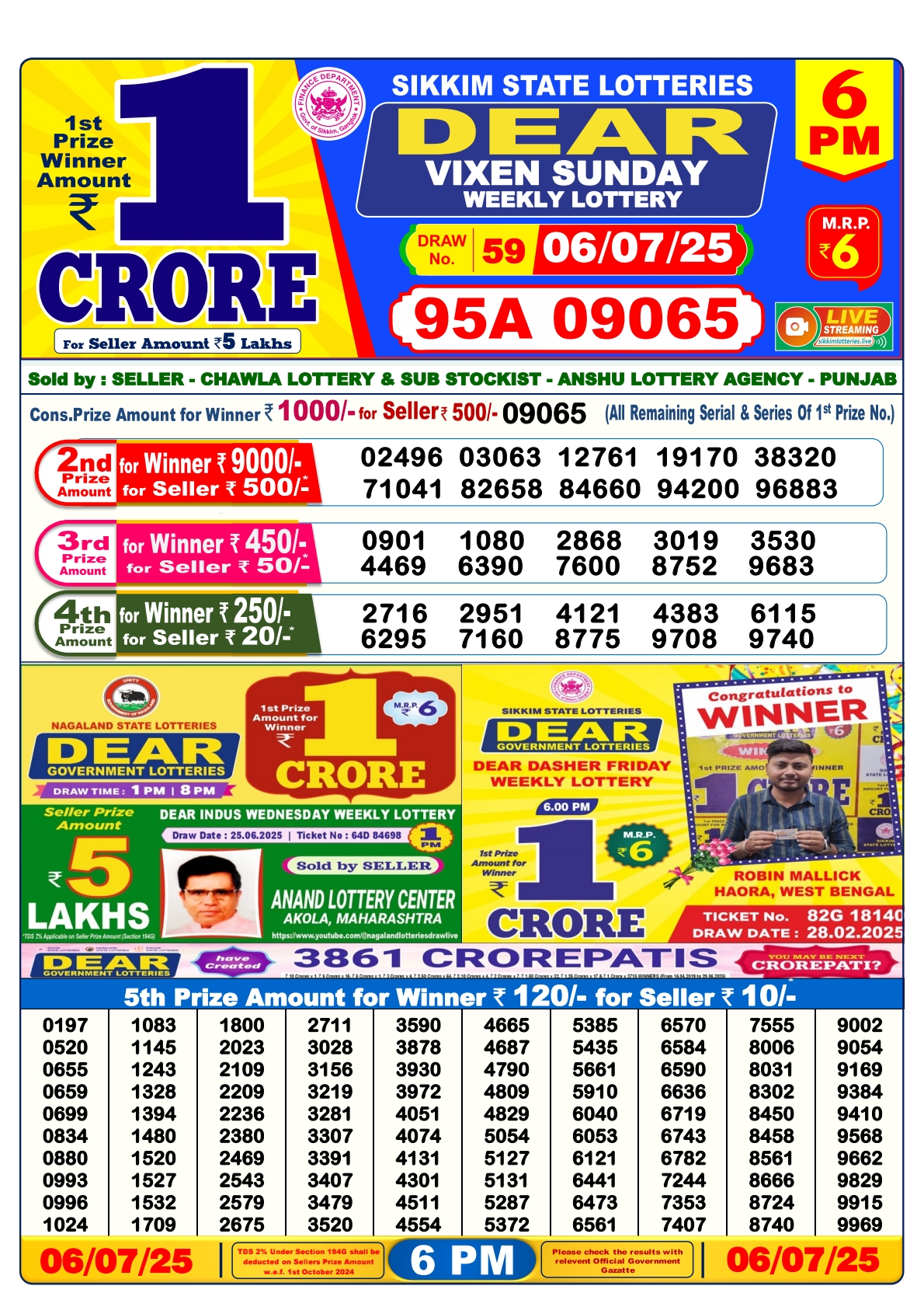 डिअर लाटरी का शाम 6 बजे का रिज़ल्ट दिनांक 06.7.25