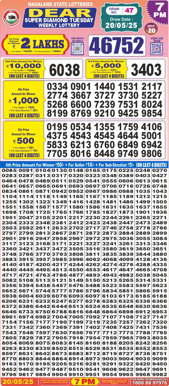 डिअर लाटरी का शाम 7 बजे का रिज़ल्ट दिनांक 20.5.25