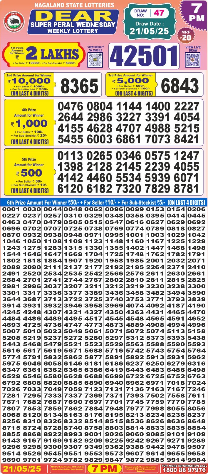 Nagaland State Lotteries was established in the year 1972 under the supervision of the Finance Department to generate a dependable source of revenue for the State Government. Nagaland State Lottery is held every day of the week at three different times of the day, Morning, Day, and Evening. Every day, the lottery is held under a different name with some difference in the prize money with the top prize worth ₹1 Crore (including Super Prize amount). The daily lotteries hosted by Nagaland State include Dear Morning Lottery, Dear Day Lottery, and Dear Evening Lottery which costs 6 Rupees for each ticket.