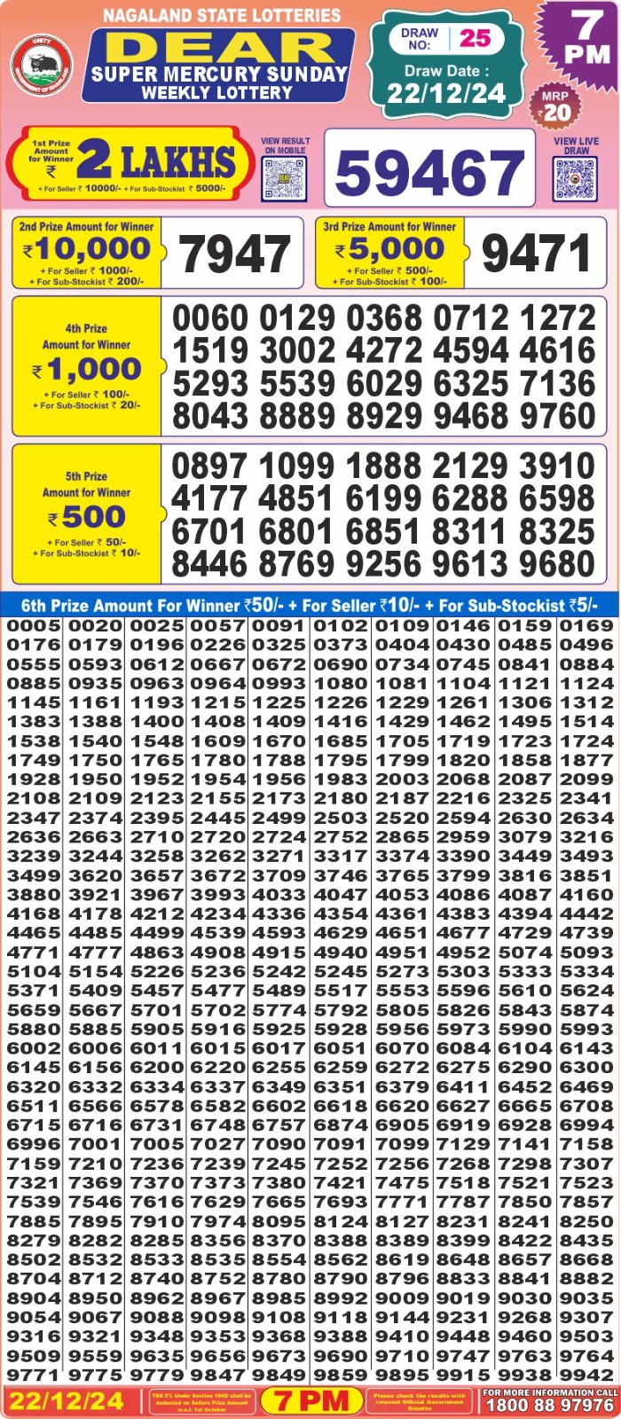 Nagaland State Lotteries was established in the year 1972 under the supervision of the Finance Department to generate a dependable source of revenue for the State Government. Nagaland State Lottery is held every day of the week at three different times of the day, Morning, Day, and Evening. Every day, the lottery is held under a different name with some difference in the prize money with the top prize worth ₹1 Crore (including Super Prize amount). The daily lotteries hosted by Nagaland State include Dear Morning Lottery, Dear Day Lottery, and Dear Evening Lottery which costs 6 Rupees for each ticket.