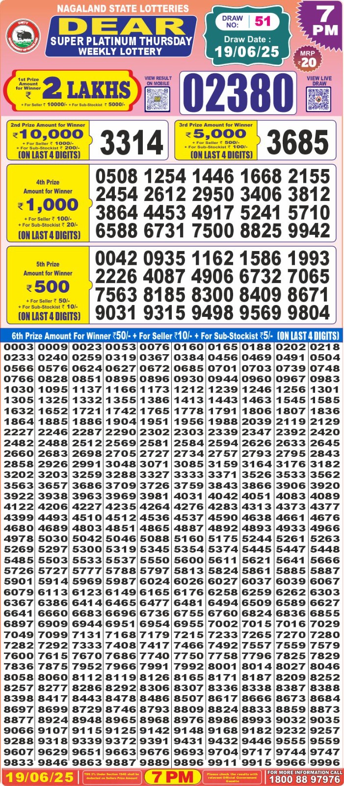 डिअर लाटरी का शाम 7 बजे का रिज़ल्ट दिनांक 19.6.25