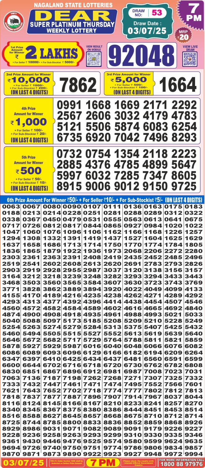 डिअर लाटरी का शाम 7 बजे का रिज़ल्ट दिनांक 03.7.25