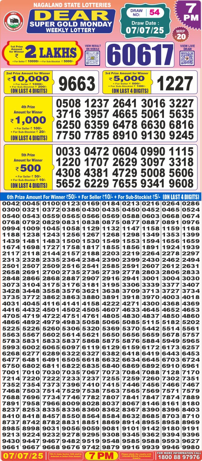 डिअर लाटरी का शाम 7 बजे का रिज़ल्ट दिनांक 07.7.25