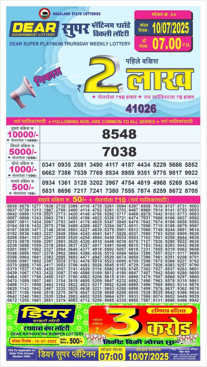 डिअर लाटरी का शाम 7 बजे का रिज़ल्ट दिनांक 10.7.25