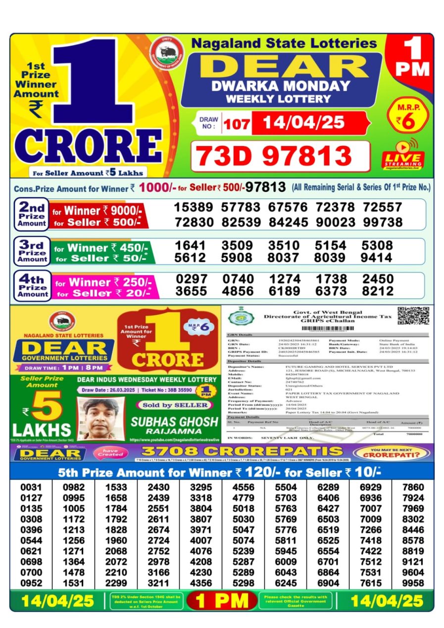 Nagaland State Lotteries was established in the year 1972 under the supervision of the Finance Department to generate a dependable source of revenue for the State Government. Nagaland State Lottery is held every day of the week at three different times of the day, Morning, Day, and Evening. Every day, the lottery is held under a different name with some difference in the prize money with the top prize worth ₹1 Crore (including Super Prize amount). The daily lotteries hosted by Nagaland State include Dear Morning Lottery, Dear Day Lottery, and Dear Evening Lottery which costs 6 Rupees for each ticket.