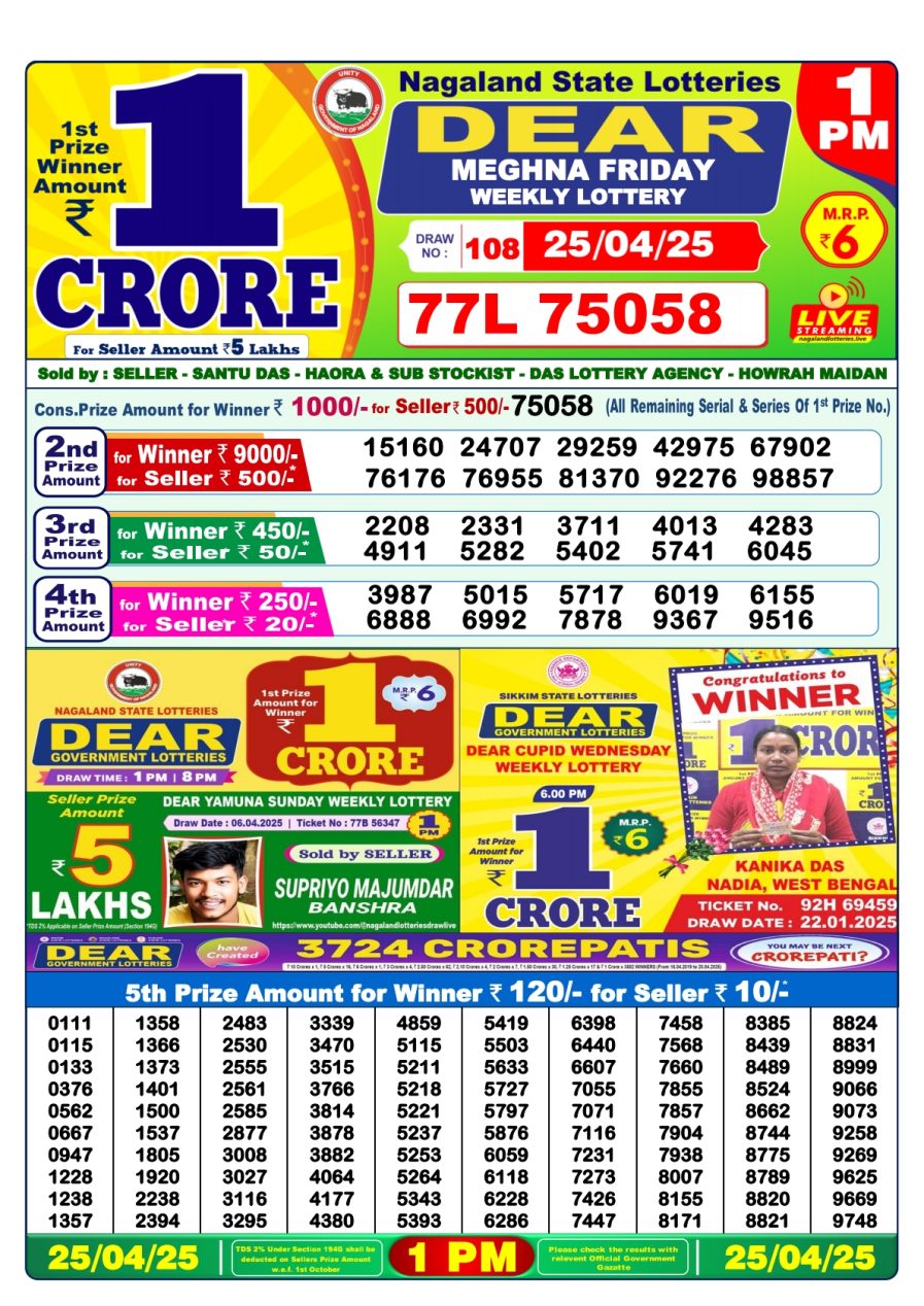 Nagaland State Lotteries was established in the year 1972 under the supervision of the Finance Department to generate a dependable source of revenue for the State Government. Nagaland State Lottery is held every day of the week at three different times of the day, Morning, Day, and Evening. Every day, the lottery is held under a different name with some difference in the prize money with the top prize worth ₹1 Crore (including Super Prize amount). The daily lotteries hosted by Nagaland State include Dear Morning Lottery, Dear Day Lottery, and Dear Evening Lottery which costs 6 Rupees for each ticket.