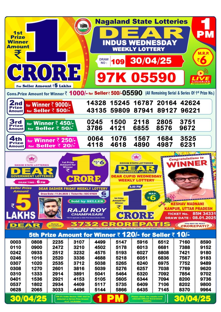 Nagaland State Lotteries was established in the year 1972 under the supervision of the Finance Department to generate a dependable source of revenue for the State Government. Nagaland State Lottery is held every day of the week at three different times of the day, Morning, Day, and Evening. Every day, the lottery is held under a different name with some difference in the prize money with the top prize worth ₹1 Crore (including Super Prize amount). The daily lotteries hosted by Nagaland State include Dear Morning Lottery, Dear Day Lottery, and Dear Evening Lottery which costs 6 Rupees for each ticket.