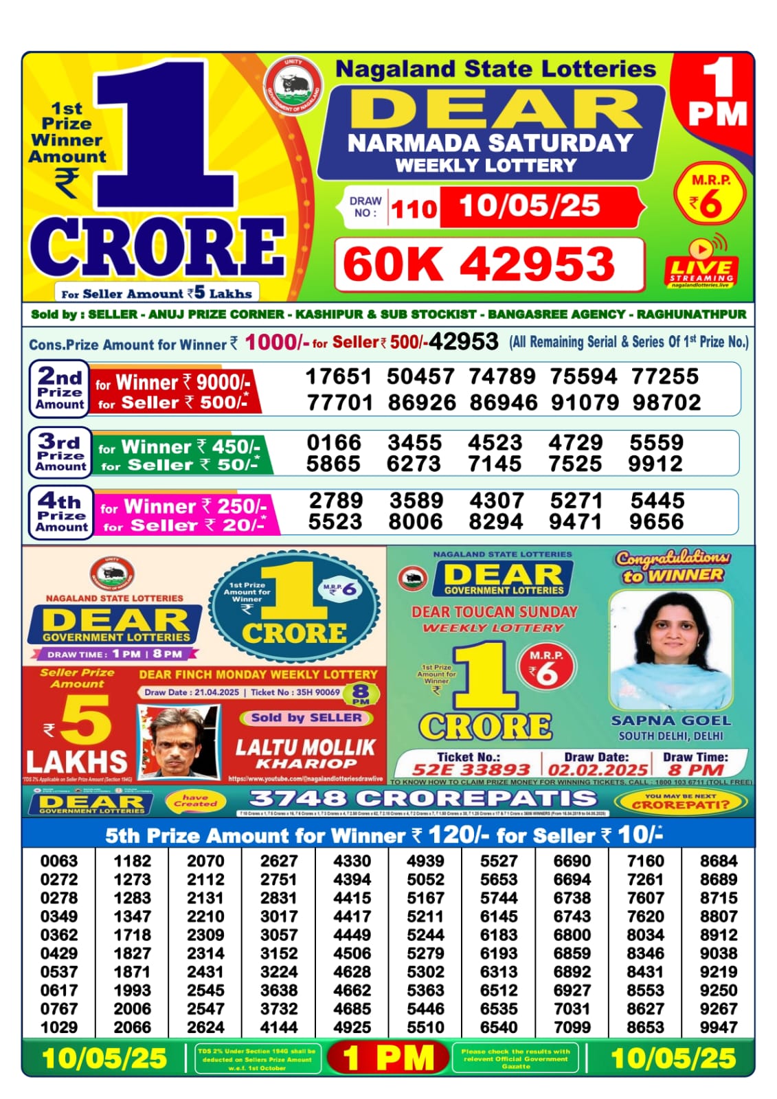 Nagaland State Lotteries was established in the year 1972 under the supervision of the Finance Department to generate a dependable source of revenue for the State Government. Nagaland State Lottery is held every day of the week at three different times of the day, Morning, Day, and Evening. Every day, the lottery is held under a different name with some difference in the prize money with the top prize worth ₹1 Crore (including Super Prize amount). The daily lotteries hosted by Nagaland State include Dear Morning Lottery, Dear Day Lottery, and Dear Evening Lottery which costs 6 Rupees for each ticket.