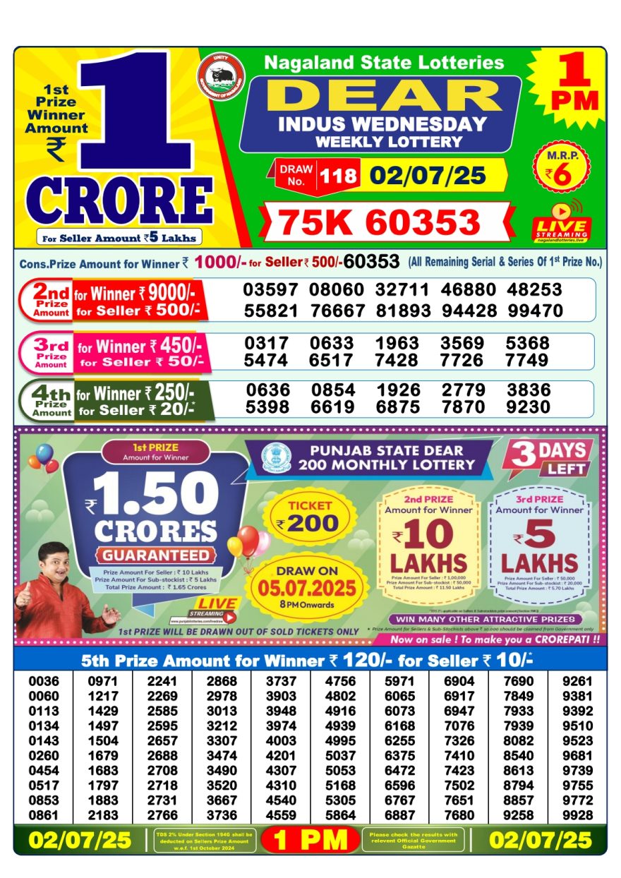 डिअर लाटरी का 1 बजे का रिज़ल्ट दिनांक 02.7.25