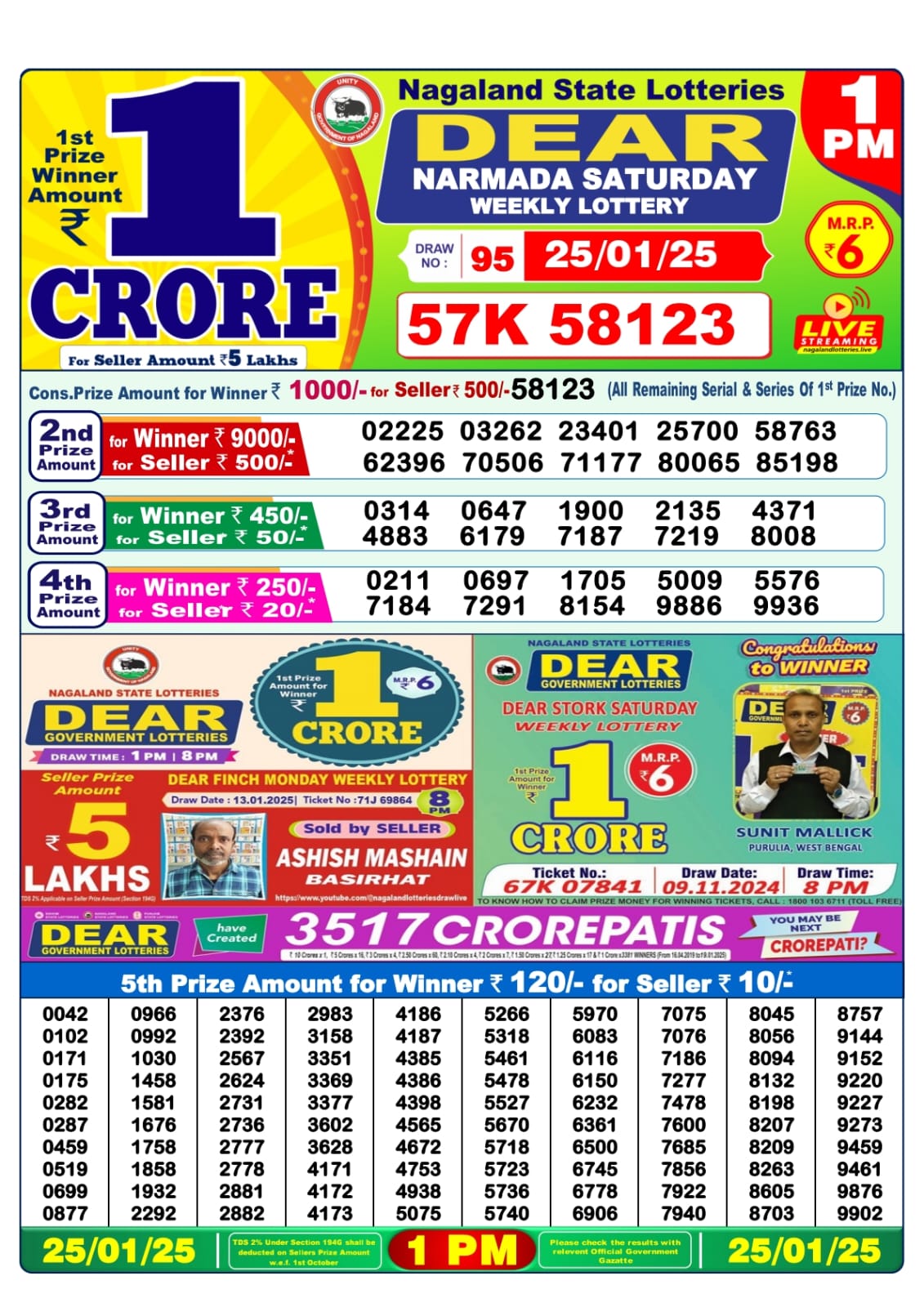 Nagaland State Lotteries was established in the year 1972 under the supervision of the Finance Department to generate a dependable source of revenue for the State Government. Nagaland State Lottery is held every day of the week at three different times of the day, Morning, Day, and Evening. Every day, the lottery is held under a different name with some difference in the prize money with the top prize worth ₹1 Crore (including Super Prize amount). The daily lotteries hosted by Nagaland State include Dear Morning Lottery, Dear Day Lottery, and Dear Evening Lottery which costs 6 Rupees for each ticket.