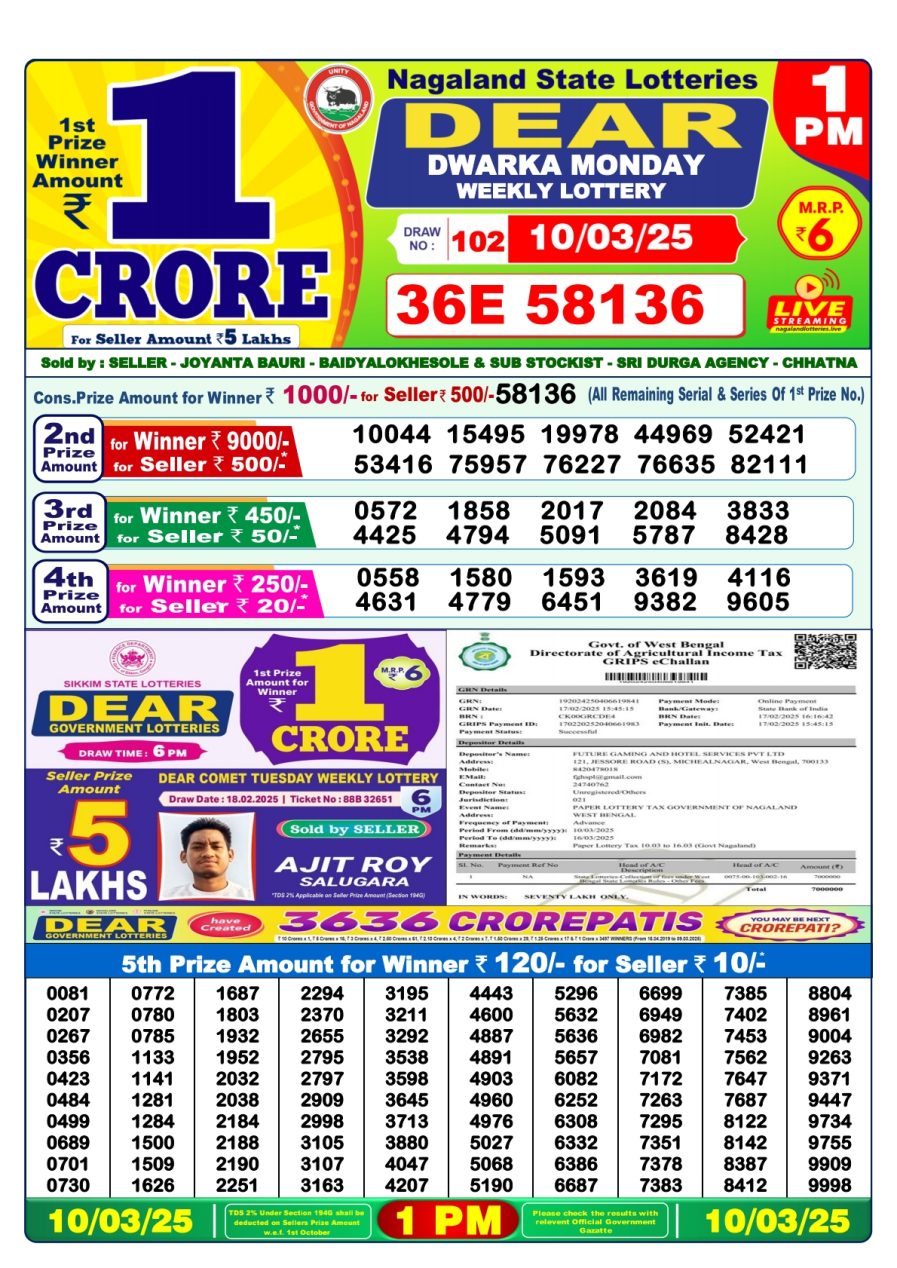 Nagaland State Lotteries was established in the year 1972 under the supervision of the Finance Department to generate a dependable source of revenue for the State Government. Nagaland State Lottery is held every day of the week at three different times of the day, Morning, Day, and Evening. Every day, the lottery is held under a different name with some difference in the prize money with the top prize worth ₹1 Crore (including Super Prize amount). The daily lotteries hosted by Nagaland State include Dear Morning Lottery, Dear Day Lottery, and Dear Evening Lottery which costs 6 Rupees for each ticket.