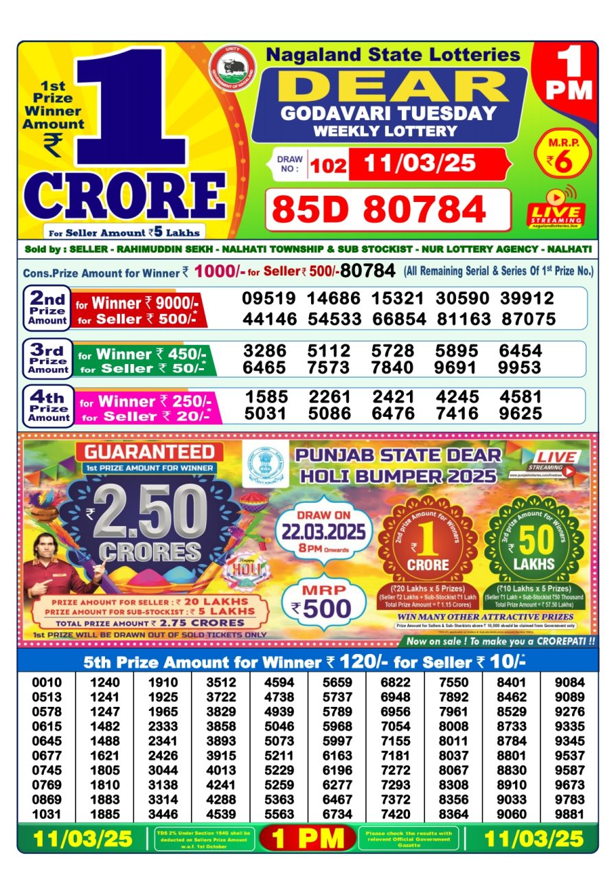 Nagaland State Lotteries was established in the year 1972 under the supervision of the Finance Department to generate a dependable source of revenue for the State Government. Nagaland State Lottery is held every day of the week at three different times of the day, Morning, Day, and Evening. Every day, the lottery is held under a different name with some difference in the prize money with the top prize worth ₹1 Crore (including Super Prize amount). The daily lotteries hosted by Nagaland State include Dear Morning Lottery, Dear Day Lottery, and Dear Evening Lottery which costs 6 Rupees for each ticket.