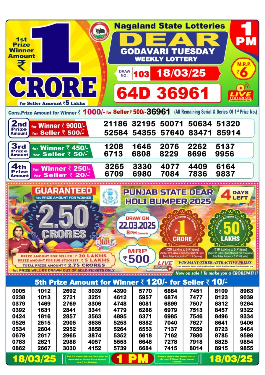 Nagaland State Lotteries was established in the year 1972 under the supervision of the Finance Department to generate a dependable source of revenue for the State Government. Nagaland State Lottery is held every day of the week at three different times of the day, Morning, Day, and Evening. Every day, the lottery is held under a different name with some difference in the prize money with the top prize worth ₹1 Crore (including Super Prize amount). The daily lotteries hosted by Nagaland State include Dear Morning Lottery, Dear Day Lottery, and Dear Evening Lottery which costs 6 Rupees for each ticket.