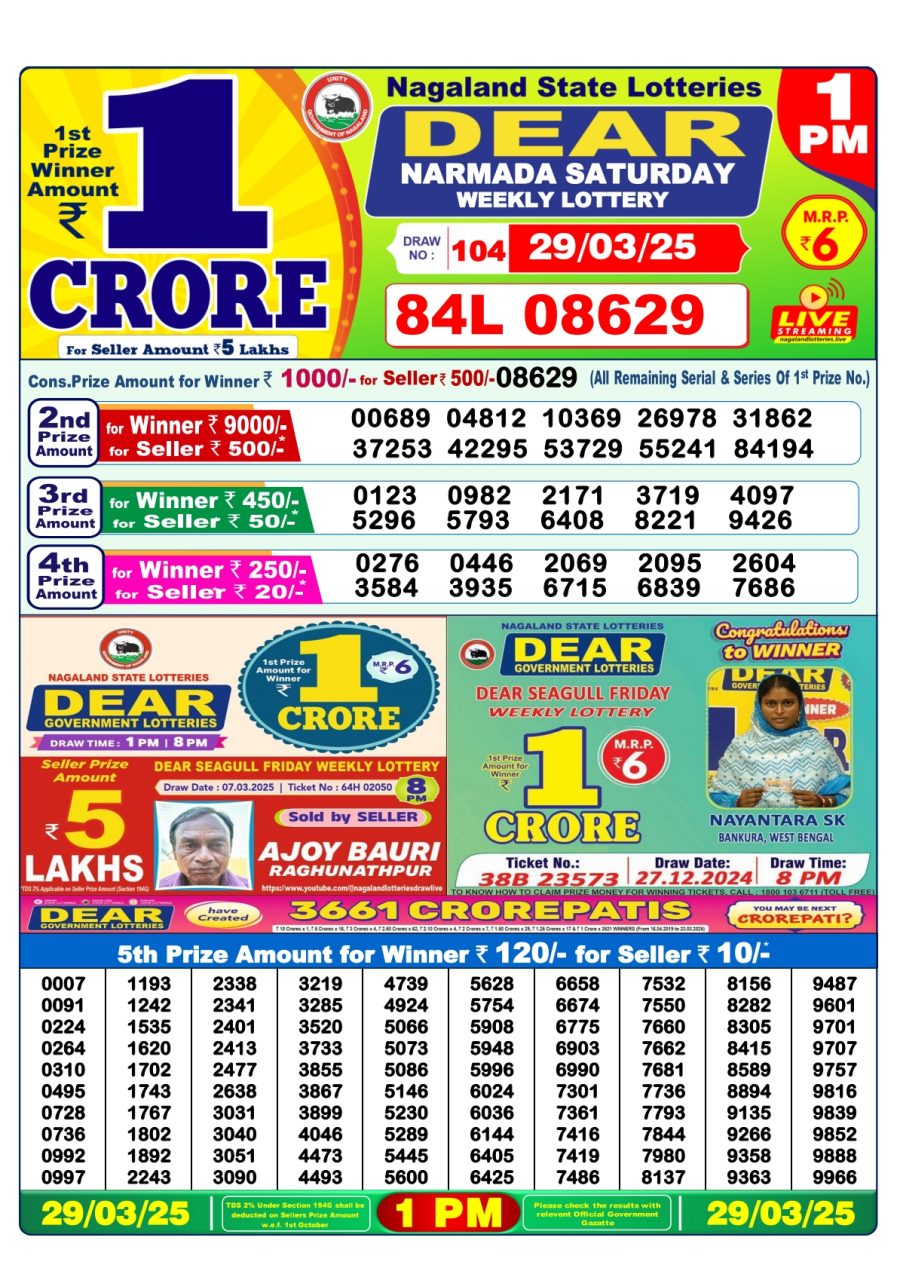 Nagaland State Lotteries was established in the year 1972 under the supervision of the Finance Department to generate a dependable source of revenue for the State Government. Nagaland State Lottery is held every day of the week at three different times of the day, Morning, Day, and Evening. Every day, the lottery is held under a different name with some difference in the prize money with the top prize worth ₹1 Crore (including Super Prize amount). The daily lotteries hosted by Nagaland State include Dear Morning Lottery, Dear Day Lottery, and Dear Evening Lottery which costs 6 Rupees for each ticket.