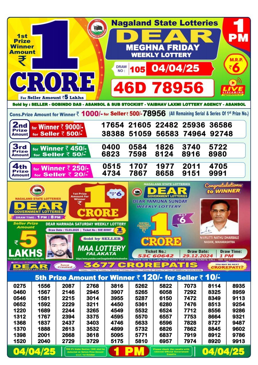 Nagaland State Lotteries was established in the year 1972 under the supervision of the Finance Department to generate a dependable source of revenue for the State Government. Nagaland State Lottery is held every day of the week at three different times of the day, Morning, Day, and Evening. Every day, the lottery is held under a different name with some difference in the prize money with the top prize worth ₹1 Crore (including Super Prize amount). The daily lotteries hosted by Nagaland State include Dear Morning Lottery, Dear Day Lottery, and Dear Evening Lottery which costs 6 Rupees for each ticket.