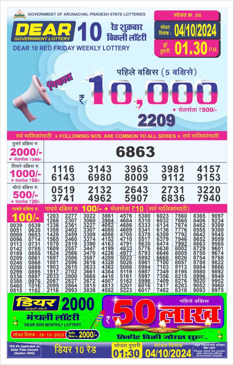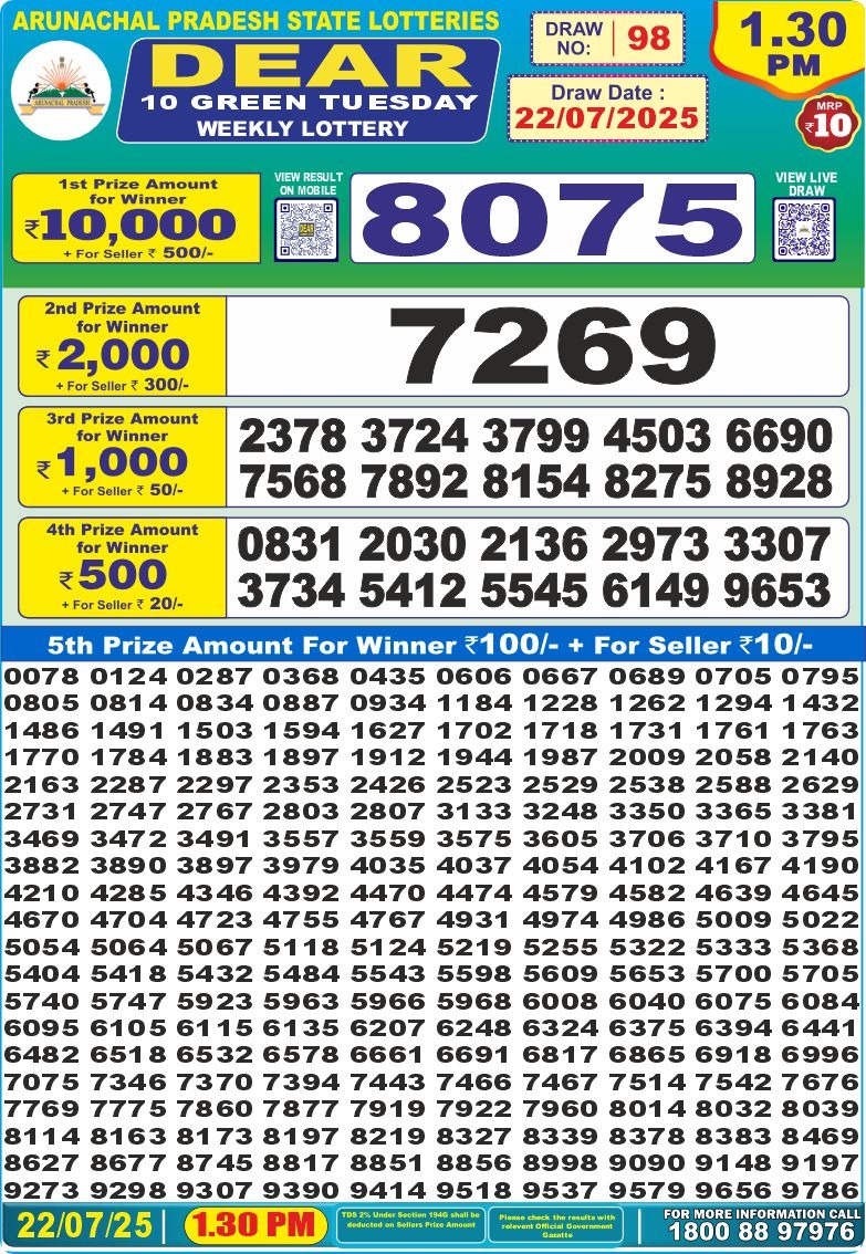 डिअर 10 लाटरी का दोपहर 1:30 बजे का रिज़ल्ट दिनांक 22.7.25
