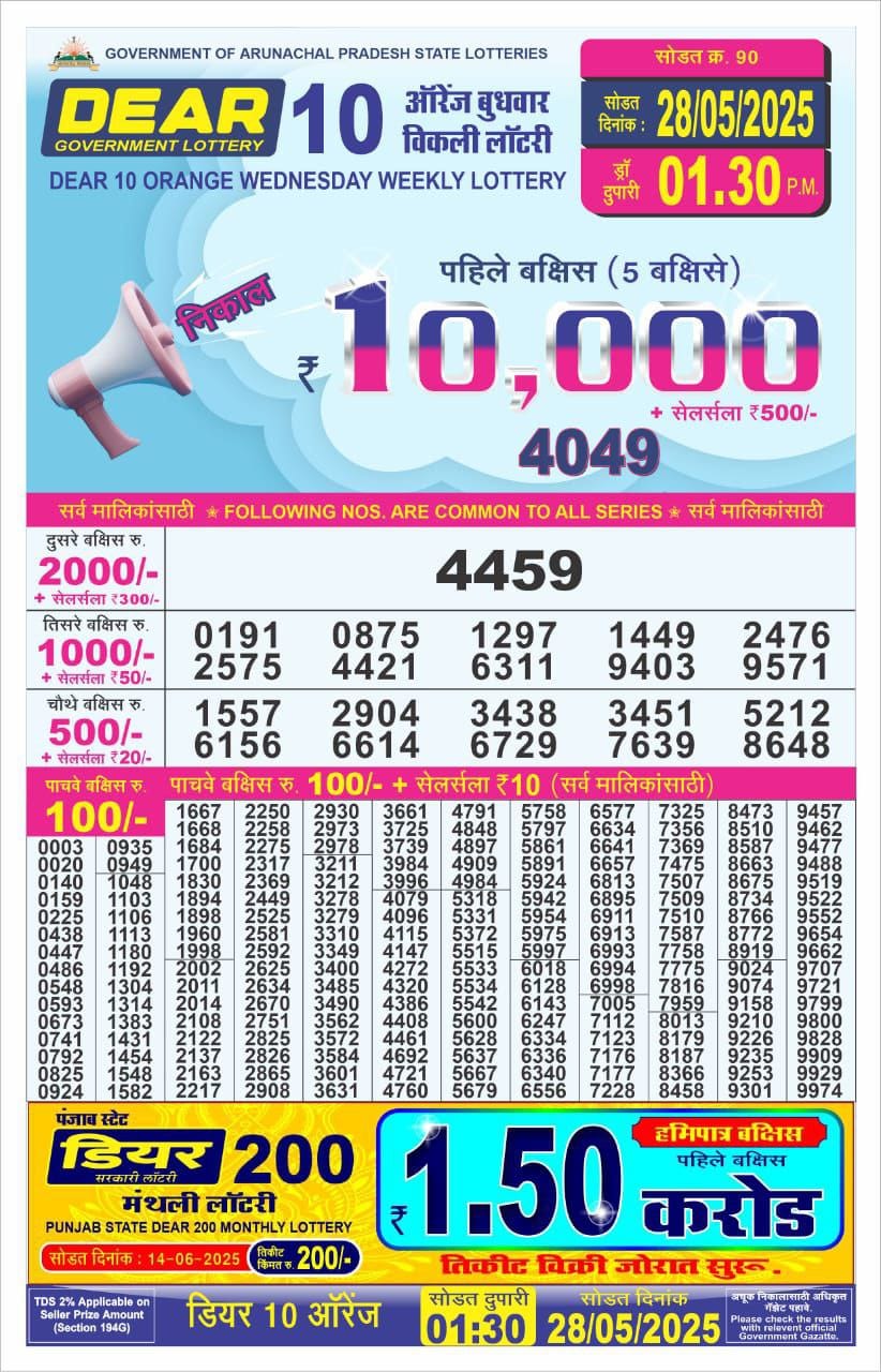 डिअर 10 लाटरी का दोपहर 1:30 बजे का रिज़ल्ट दिनांक 28.5.25