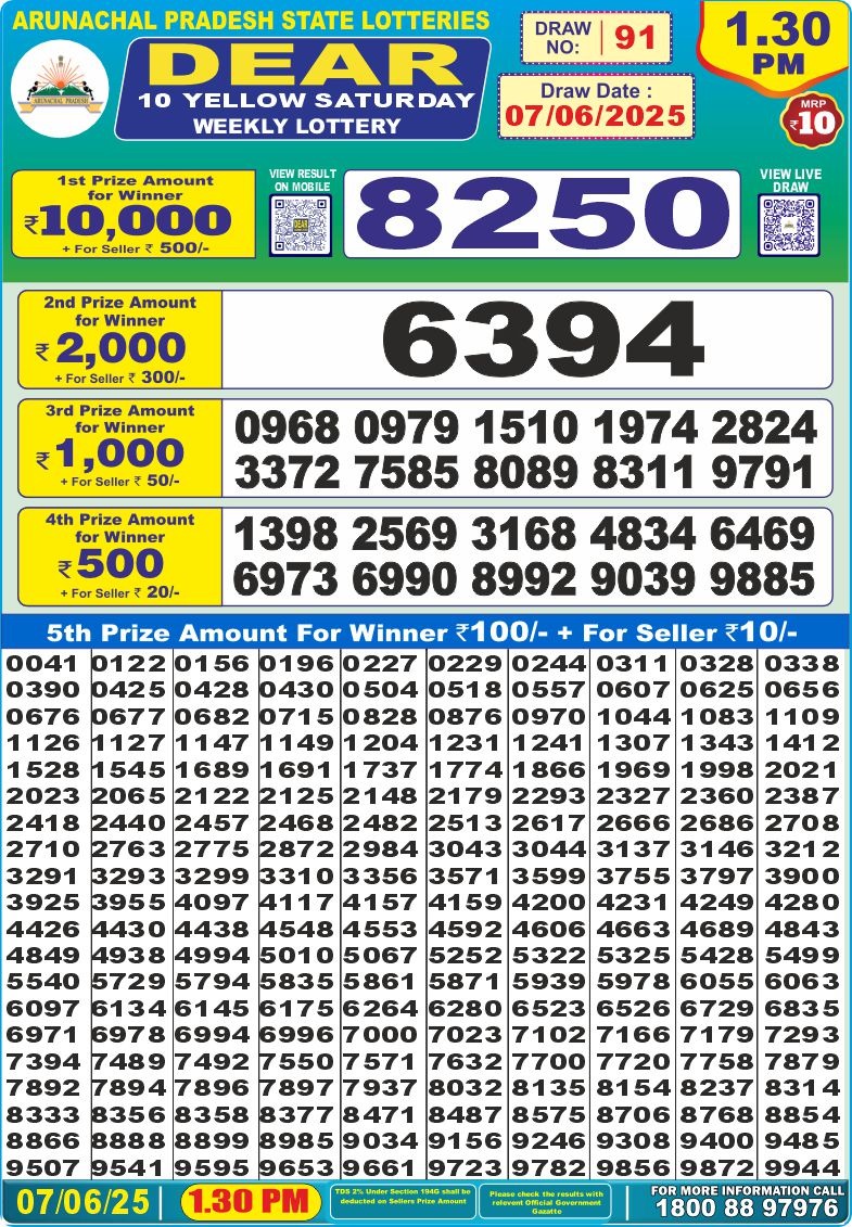 डिअर 10 लाटरी का दोपहर 1:30 बजे का रिज़ल्ट दिनांक 7.6.25