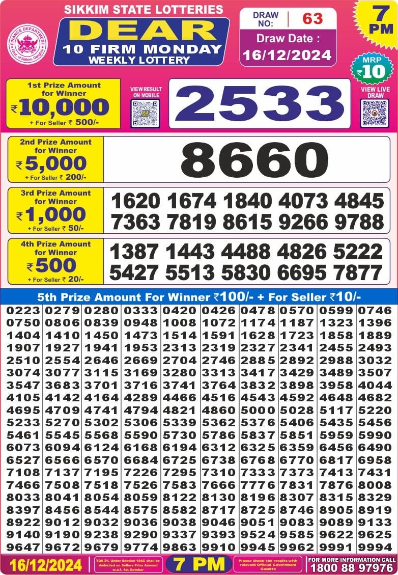 Nagaland State Lotteries was established in the year 1972 under the supervision of the Finance Department to generate a dependable source of revenue for the State Government. Nagaland State Lottery is held every day of the week at three different times of the day, Morning, Day, and Evening. Every day, the lottery is held under a different name with some difference in the prize money with the top prize worth ₹1 Crore (including Super Prize amount). The daily lotteries hosted by Nagaland State include Dear Morning Lottery, Dear Day Lottery, and Dear Evening Lottery which costs 6 Rupees for each ticket.