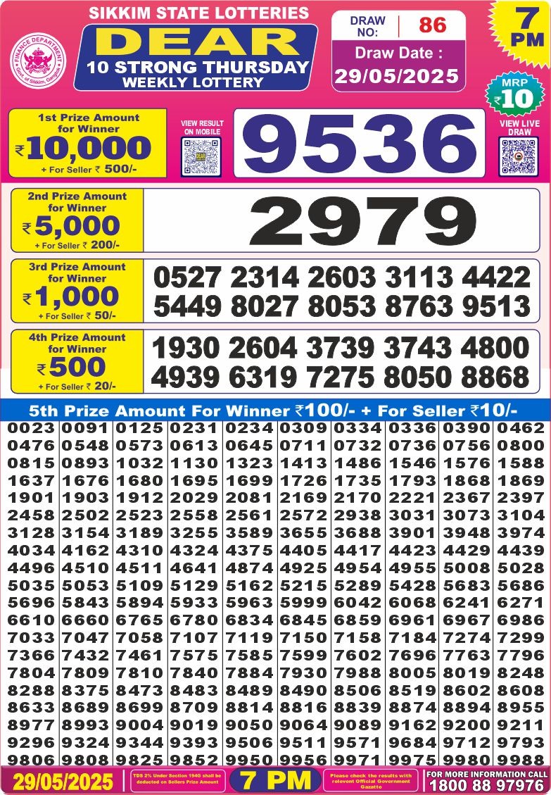 डिअर 10 लाटरी का शाम 7 बजे का रिज़ल्ट दिनांक 29.5.25