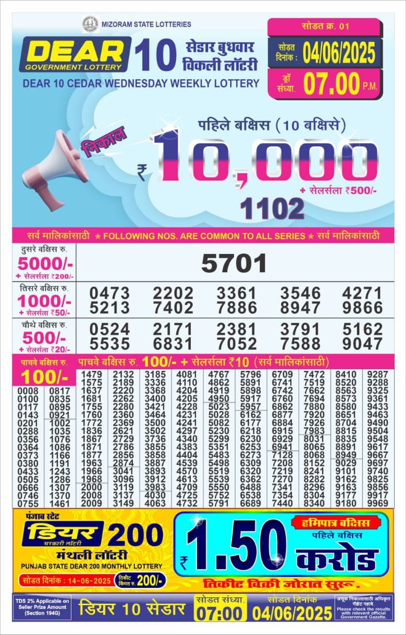 डिअर 10 लाटरी का शाम 7 बजे का रिज़ल्ट दिनांक 4.6.25