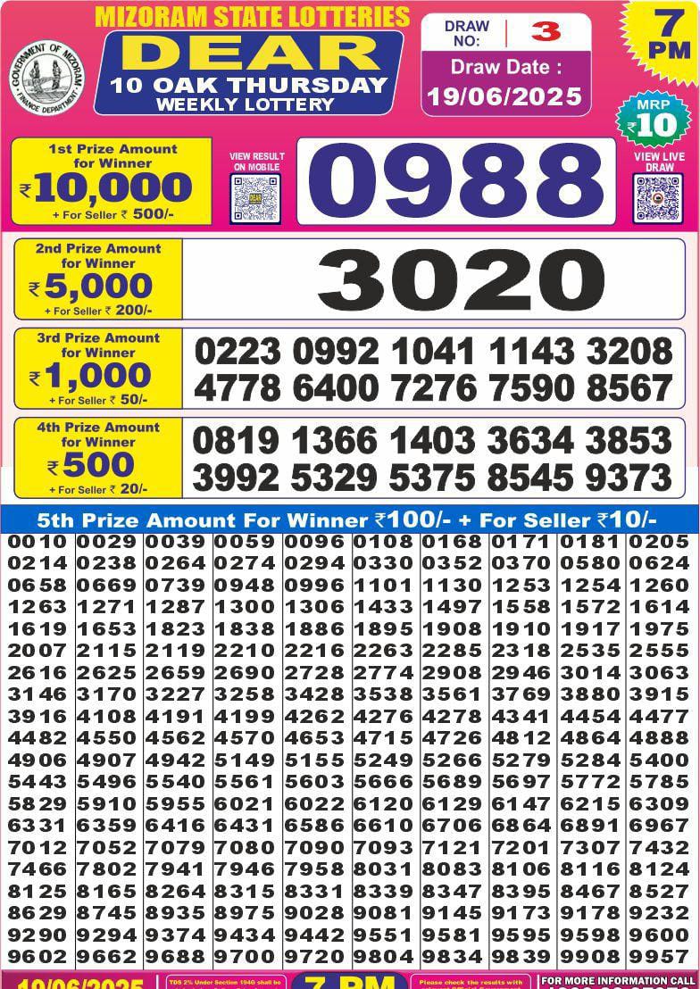 डिअर 10 लाटरी का शाम 7 बजे का रिज़ल्ट दिनांक 19.6.25