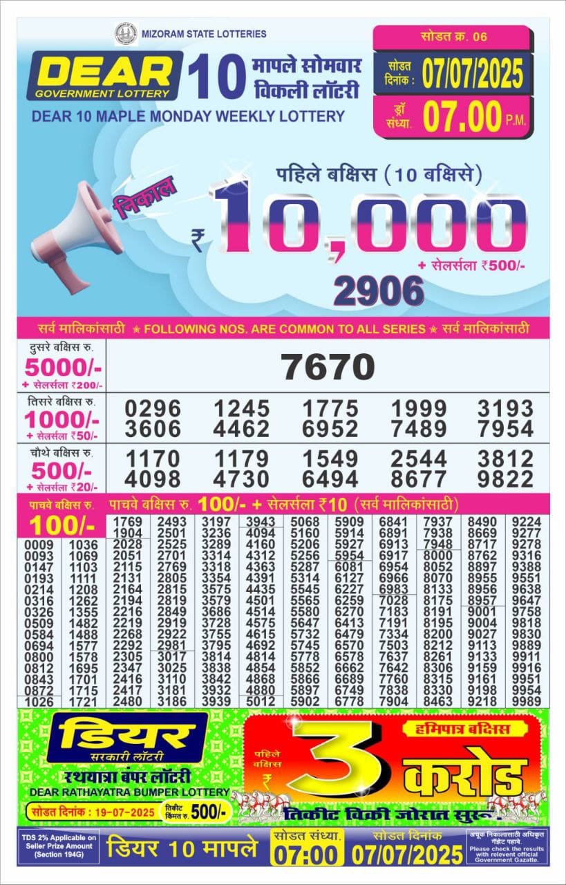 डिअर 10 लाटरी का शाम 7 बजे का रिज़ल्ट दिनांक 07.7.25