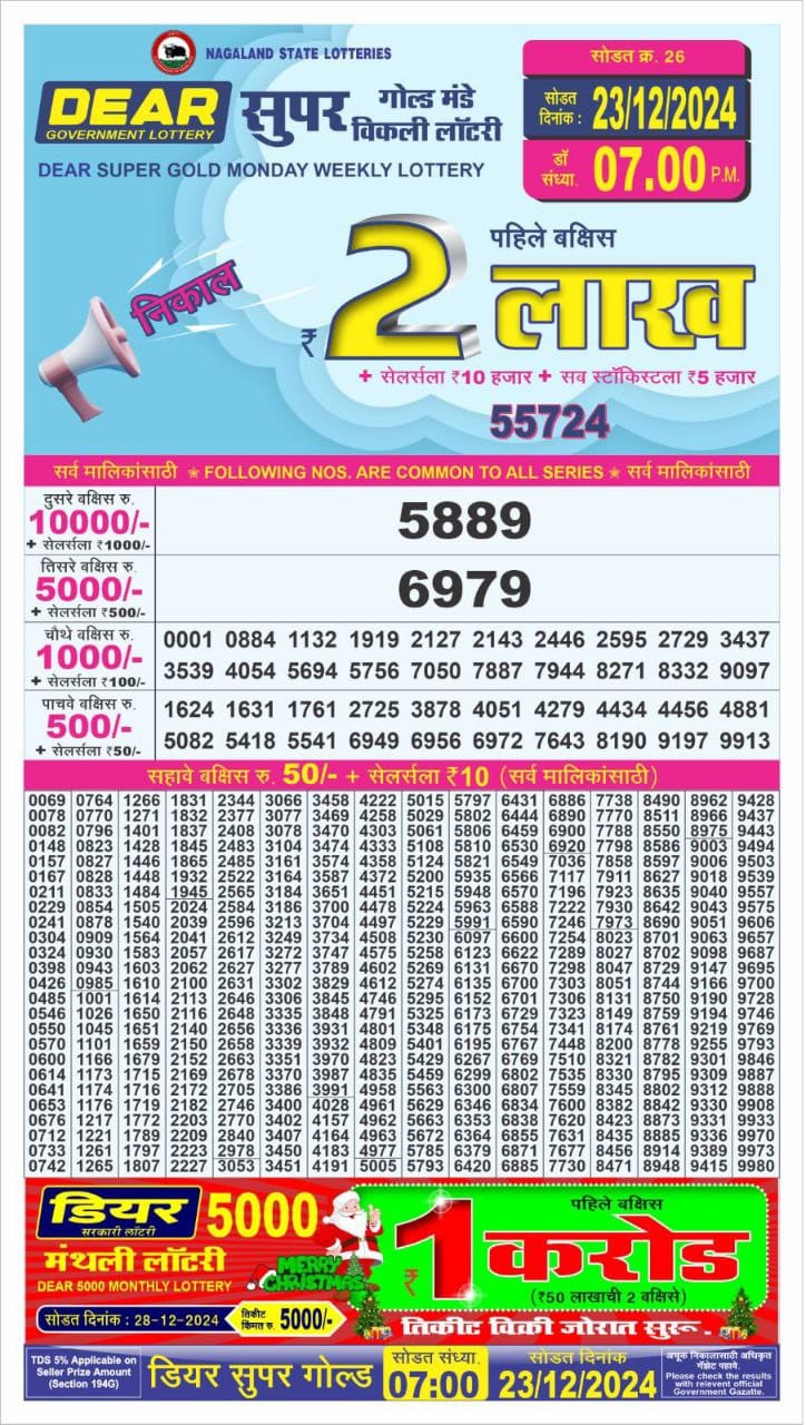 Nagaland State Lotteries was established in the year 1972 under the supervision of the Finance Department to generate a dependable source of revenue for the State Government. Nagaland State Lottery is held every day of the week at three different times of the day, Morning, Day, and Evening. Every day, the lottery is held under a different name with some difference in the prize money with the top prize worth ₹1 Crore (including Super Prize amount). The daily lotteries hosted by Nagaland State include Dear Morning Lottery, Dear Day Lottery, and Dear Evening Lottery which costs 6 Rupees for each ticket.