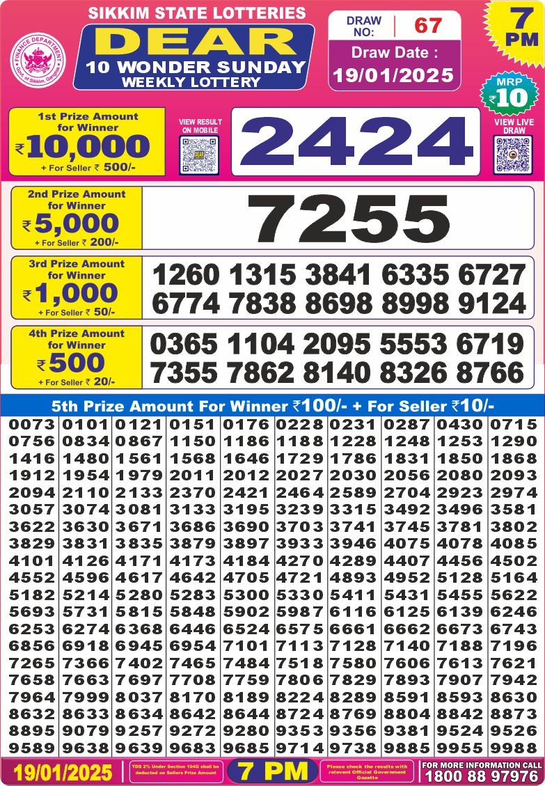 Nagaland State Lotteries was established in the year 1972 under the supervision of the Finance Department to generate a dependable source of revenue for the State Government. Nagaland State Lottery is held every day of the week at three different times of the day, Morning, Day, and Evening. Every day, the lottery is held under a different name with some difference in the prize money with the top prize worth ₹1 Crore (including Super Prize amount). The daily lotteries hosted by Nagaland State include Dear Morning Lottery, Dear Day Lottery, and Dear Evening Lottery which costs 6 Rupees for each ticket.