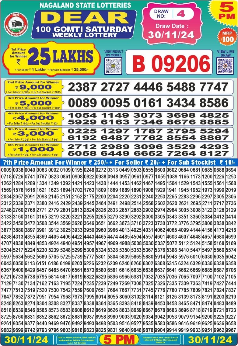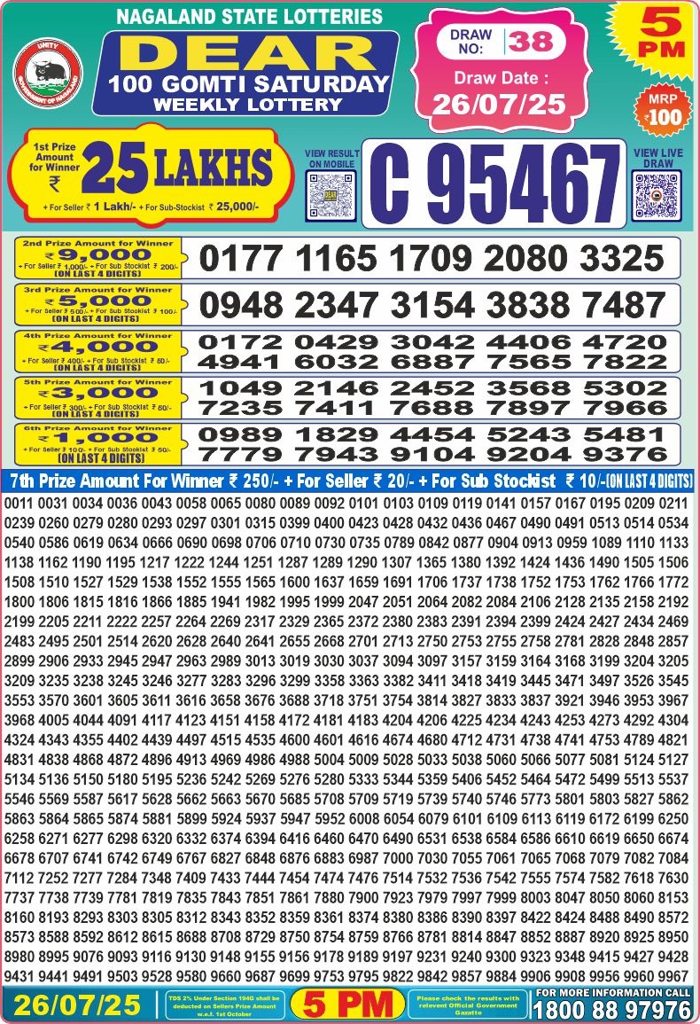 Nagaland State Lotteries was established in the year 1972 under the supervision of the Finance Department to generate a dependable source of revenue for the State Government. Nagaland State Lottery is held every day of the week at three different times of the day, Morning, Day, and Evening. Every day, the lottery is held under a different name with some difference in the prize money with the top prize worth ₹1 Crore (including Super Prize amount). The daily lotteries hosted by Nagaland State include Dear Morning Lottery, Dear Day Lottery, and Dear Evening Lottery which costs 6 Rupees for each ticket.