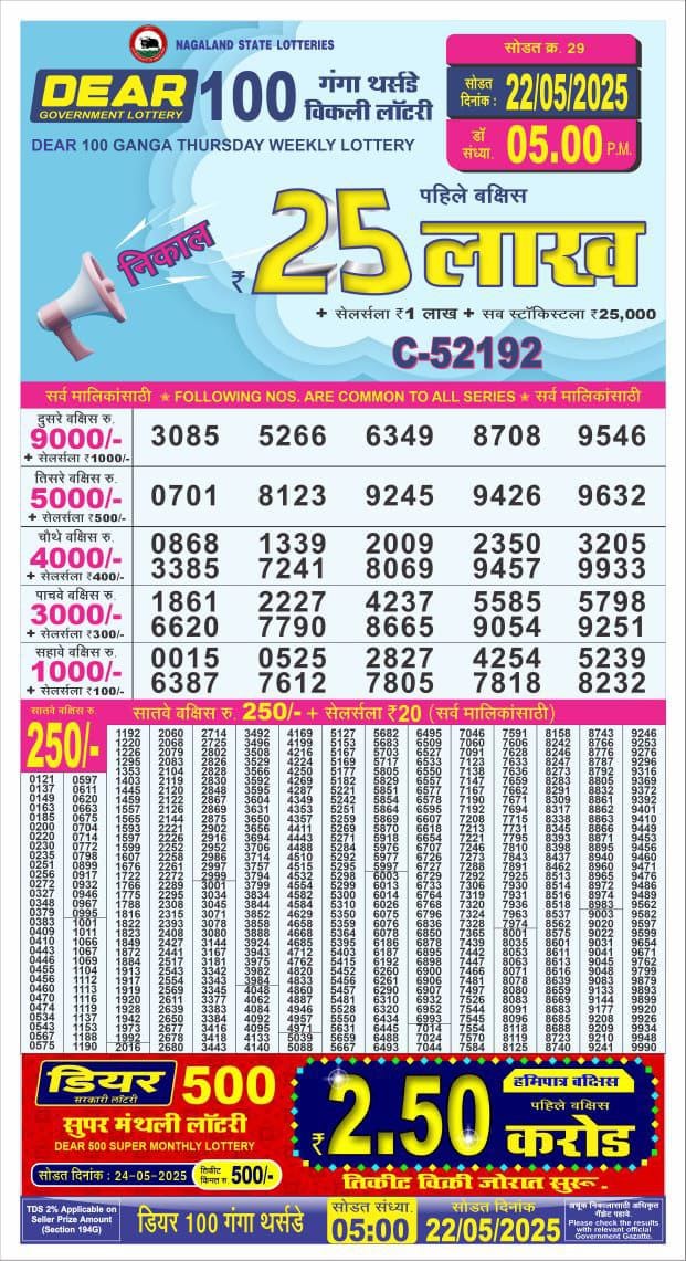 डिअर 100 लाटरी का शाम 5 बजे का रिज़ल्ट दिनांक 22.5.25
