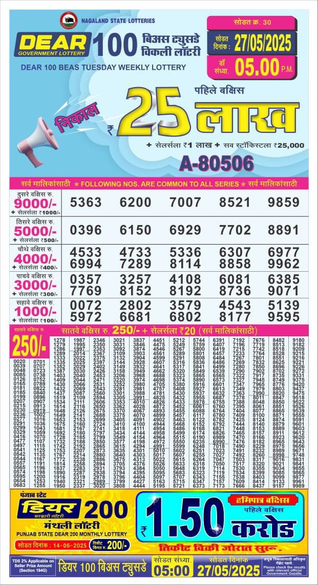 डिअर 100 लाटरी का शाम 5 बजे का रिज़ल्ट दिनांक 27.5.25