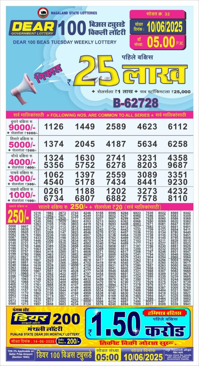 डिअर 100 लाटरी का शाम 5 बजे का रिज़ल्ट दिनांक 10.6.25