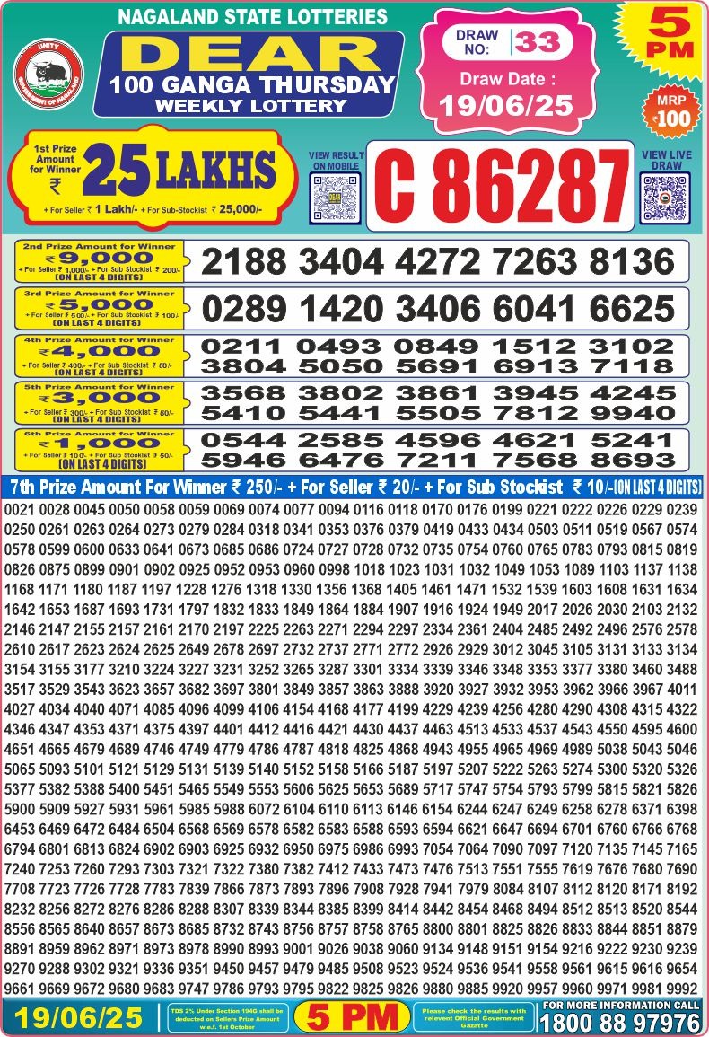 डिअर 100 लाटरी का शाम 5 बजे का रिज़ल्ट दिनांक 19.6.25