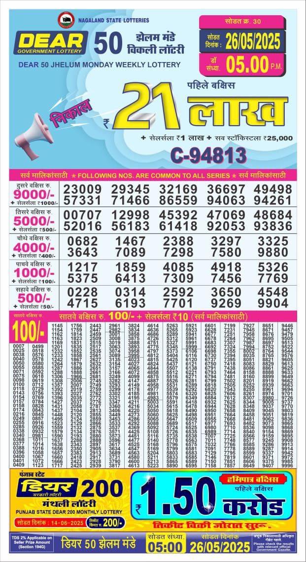 डिअर 50 लाटरी का शाम 5 बजे का रिज़ल्ट दिनांक 26.5.25