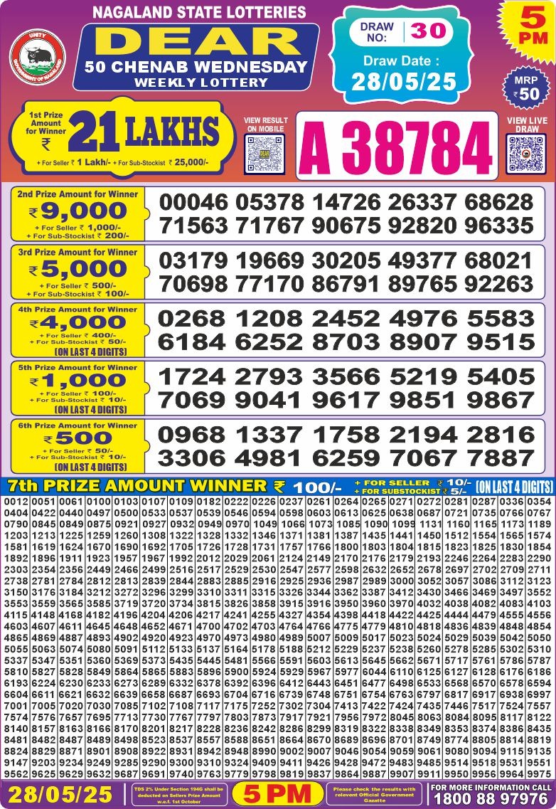 डिअर 50 लाटरी का शाम 5 बजे का रिज़ल्ट दिनांक 28.5.25