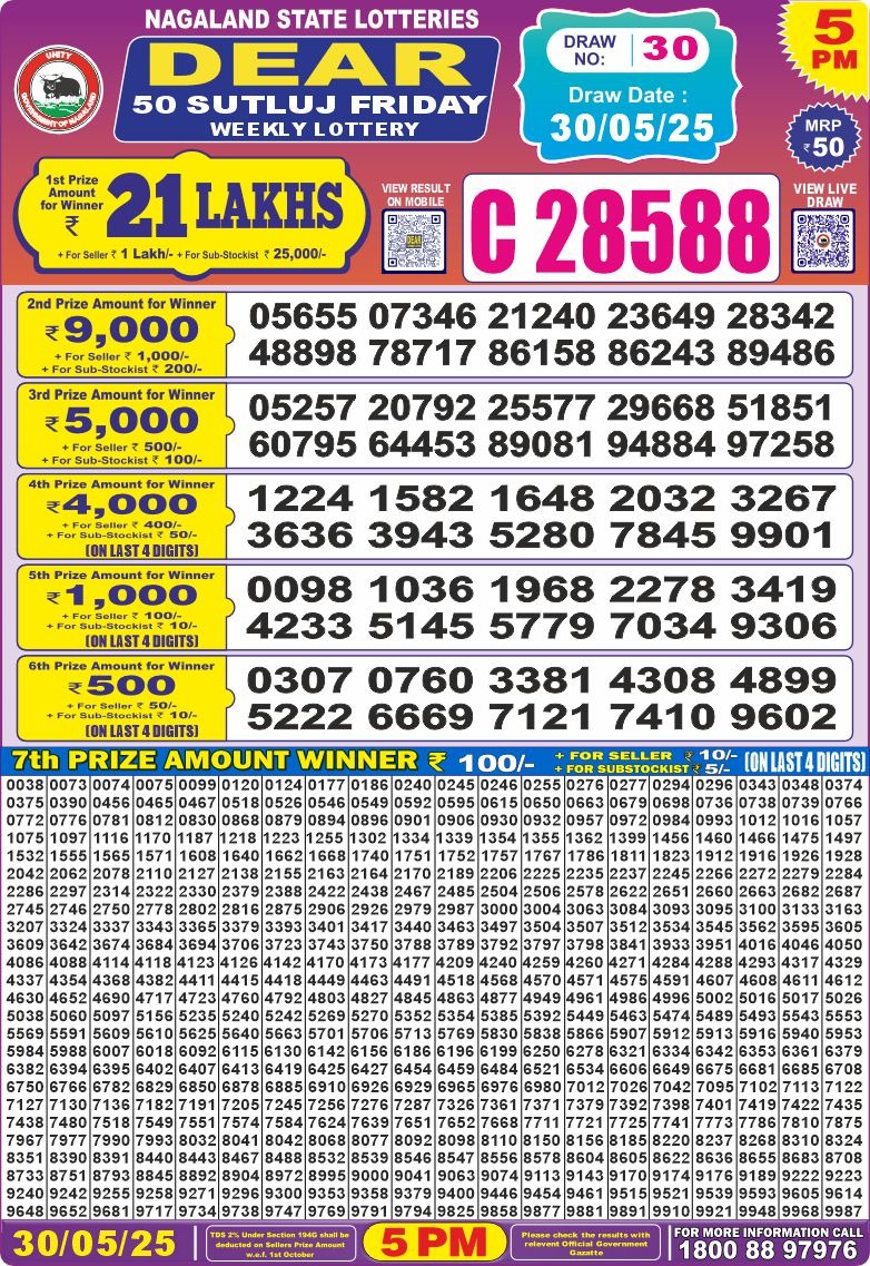 डिअर 50 लाटरी का शाम 5 बजे का रिज़ल्ट दिनांक 30.5.25