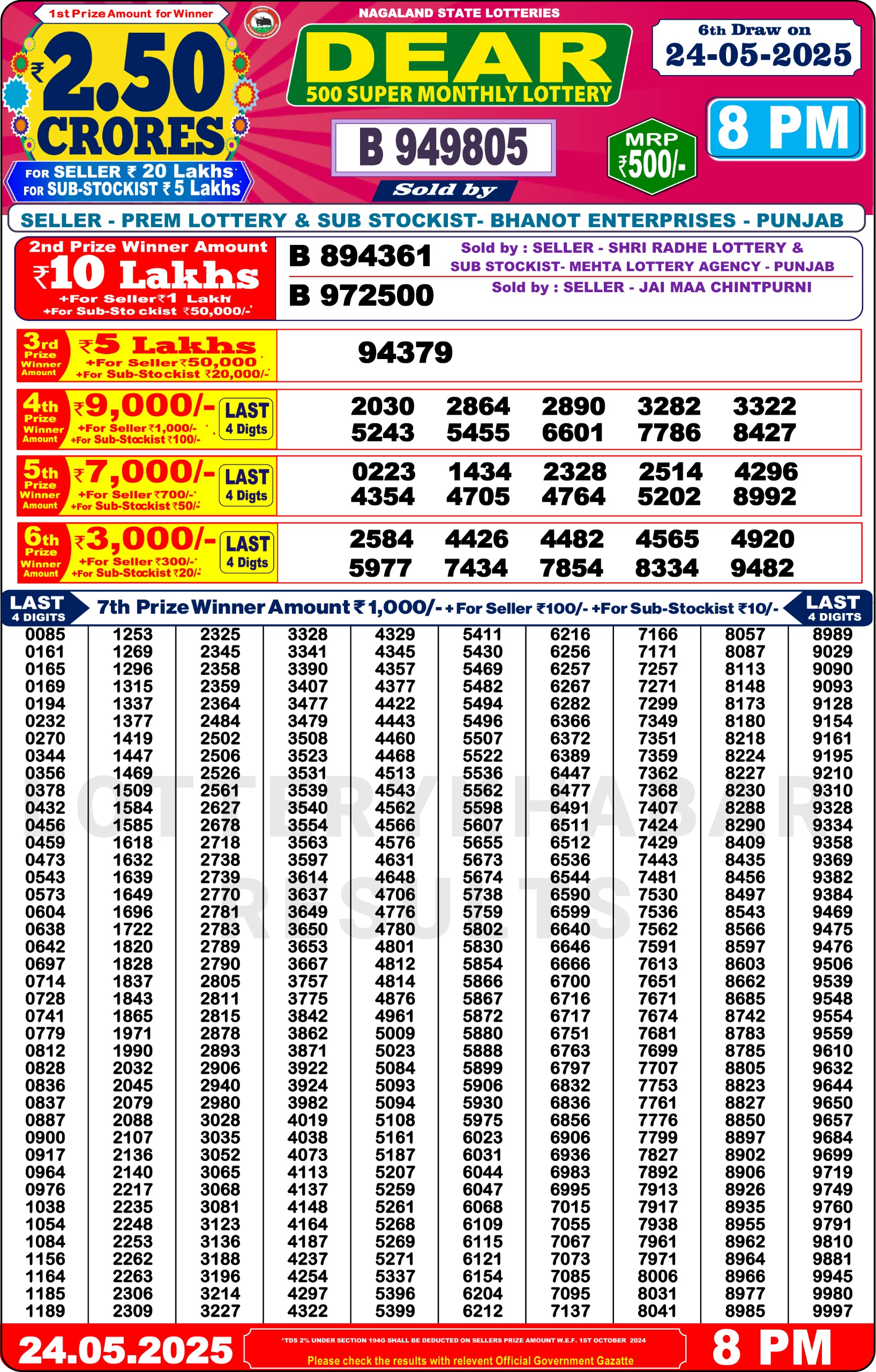 डियर 500 सुपर मंथली लॉटरी रिजल्ट 24.5.25