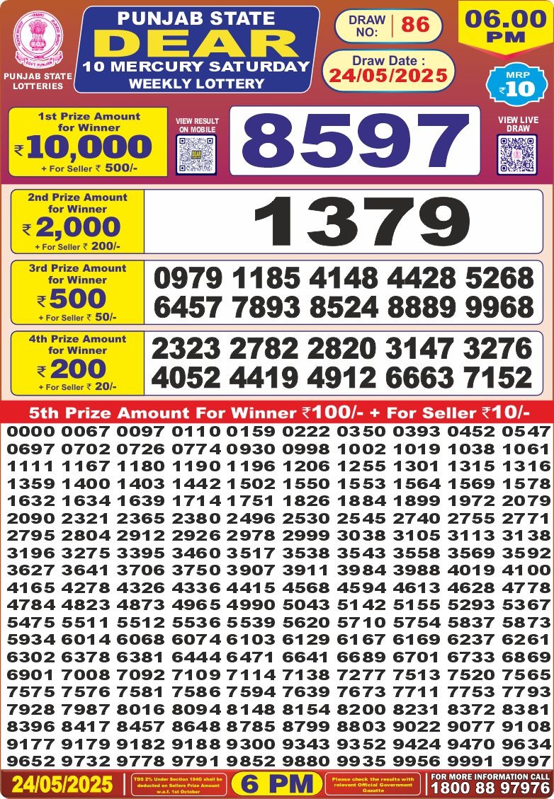 पंजाब 10 लाटरी का शाम 6 बजे का रिज़ल्ट दिनांक 24.5.25