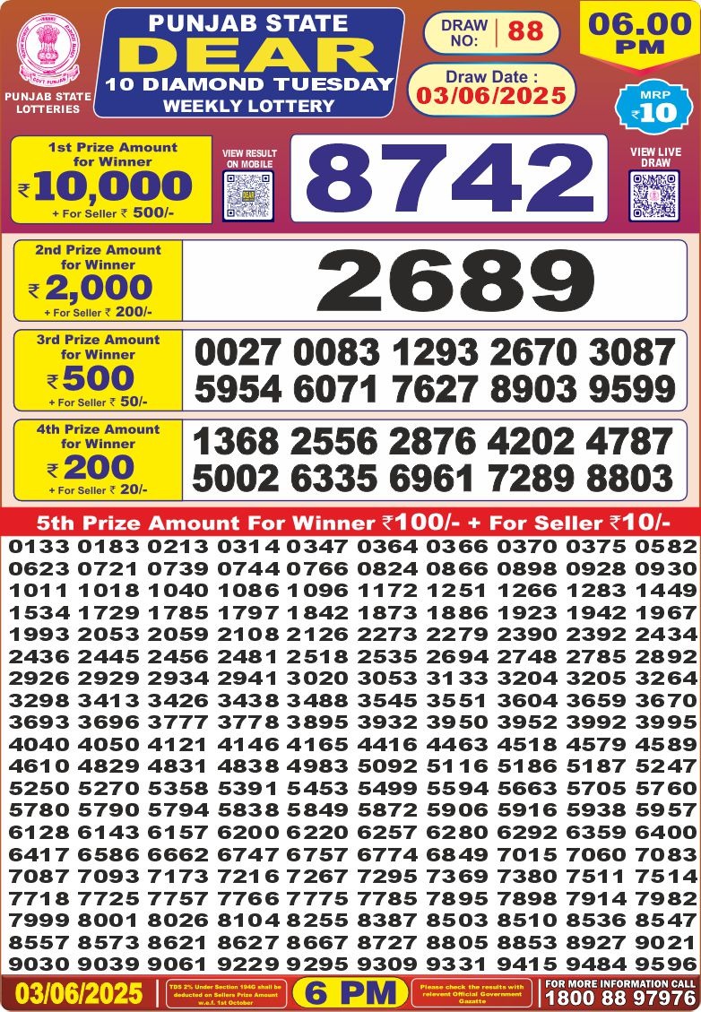 पंजाब 10 लाटरी का शाम 6 बजे का रिज़ल्ट दिनांक 3.6.25